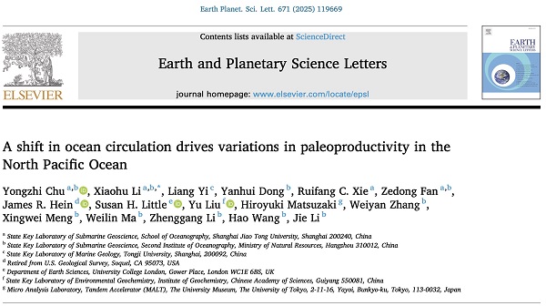 论文引用:Chu, Y.(初勇志), Li, X*.(李小虎), Yi, L., Dong, Y., Xie, R.C., Fan, Z., Hein, J.R., Little, S.H., Liu, Y., Matsuzaki, H., Zhang, W., Meng, X., Ma, W., Li, Z., Wang, H., Li, J., 2025. A shift in ocean circulation drives variations in paleoproductivity in the North Pacific Ocean. Earth and Planetary Science Letters 671. https://doi.org/10.1016/j.epsl.2025.119669.