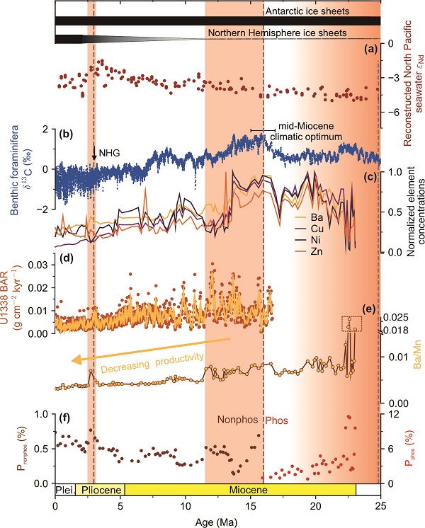 研究认为,这些高生产力事件与海洋环流格局的变化密切相关:北太平洋深水(NPDW)形成的减弱及富氧南极底层水(AABW)的加强促进了上层海洋营养盐和氧气的再分布;与此同时,南极中层水(AAIW)的增强及风尘输入的增加进一步促进了表层海洋生产力。该研究揭示了北太平洋古生产力、钡和磷的生物地球化学循环以及深层海水团环流之间的紧密耦合关系,为理解中新世以来北太平洋的海洋演化、碳循环和气候变化提供了新的地球化学证据。