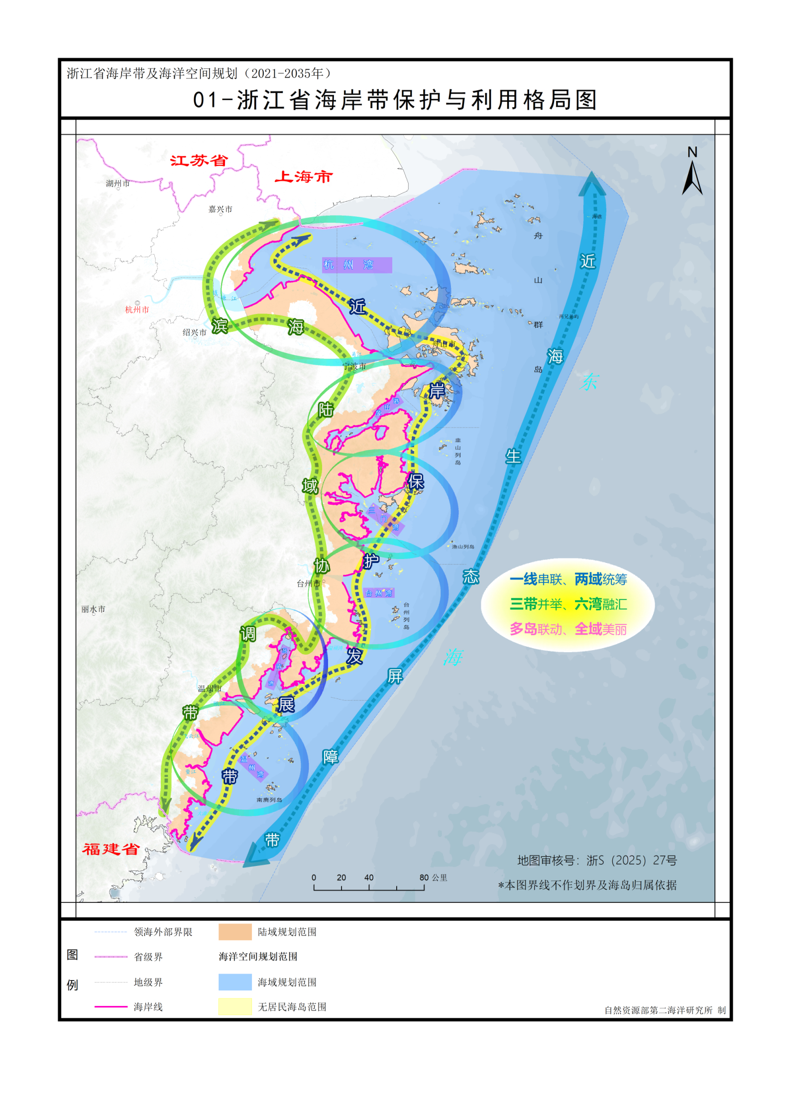 《规划》全面落实国土空间总体规划要求,整合原有海洋领域“一线四规”,首次实现海洋资源要素规划全覆盖,依托浙江省湾区密集、岛群丰富的资源禀赋,系统构建“一线串联、两域统筹、三带并举、六湾融汇、多岛联动、全域美丽”的海岸带保护利用总体格局,推动海陆一体化治理。