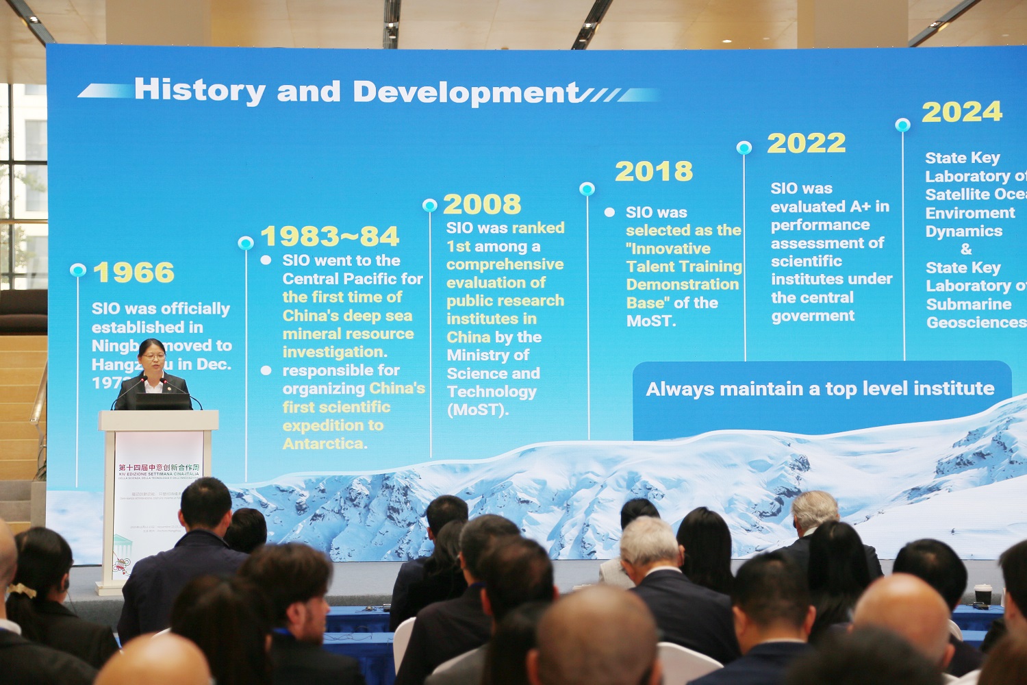 合作周期间,方银霞所长与CNR-DSSTTA主任弗朗西斯科·佩特拉基尼共同出席杭州分会场活动,方银霞所长作关于海洋动力生态环境观测预测的主旨报告,介绍我所在联合国“海洋十年”倡议框架下的国际合作情况以及我所在海洋科技创新方面的最新进展,表示中意双方在海洋科技领域具有广阔合作前景,期望在优势互补的基础上进一步深化交流与联合研究。弗朗西斯科·佩特拉基尼主任介绍了CNR-DSSTTA整体概况以及该部门在地球系统科学、海洋观测、气候变化与生态技术等领域的科研布局和优势,表示希望进一步深化与中国在海洋科技领域的合作,推动双方在联合科研项目、技术创新和海洋环境保护等方面取得更多务实成果。