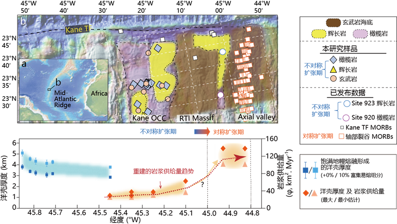 图1 大西洋中脊23°N地区地质图(a-b)以及区域内岩浆量的随时间变化(c)。自西向东,洋壳逐渐变得年轻,海底扩张机制在约0.4 Ma前由早期的不对称扩张转变为对称扩张,与此同时岩浆供给量同步地急剧升高。