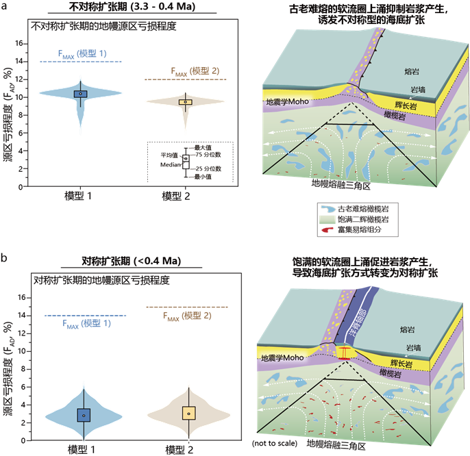 图2 软流圈成分的不均一性控制大西洋中脊23°N地区的海底扩张方式。(a)在3.3-0.4 百万年期间,由于软流圈中古老难熔地幔密度轻,优先进入洋脊下方的熔融区,造成该时期岩浆供给降低,洋脊发育拆离断层的非对称扩张;(b)0.4 百万年后,随着古老难熔地幔的迁移出熔融区,洋脊下方的软流圈中古老难熔地幔占比降低,增大了岩浆供给,拆离断层停止发育,洋脊发育对称扩张。