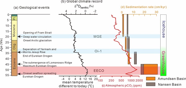 我所海底科学与划界全国重点实验室海底演化与动力过程团队的谭平川副研究员(第一作者)与李家彪院士(通讯作者)等组成的研究团队,整合分析了覆盖整个欧亚盆地的31条多道地震剖面,识别并标定了4条主要地震界面(分别代表约20 Ma、34 Ma、45 Ma与54 Ma),在此基础上计算了自始新世(54 Ma)以来各时期的沉积速率,并结合构造、气候及物源变化对其时空分布特征进行了解释。