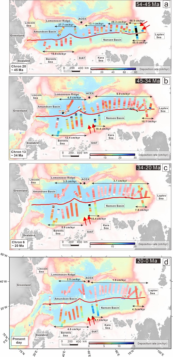结果显示:54–45 Ma(始新世早期):南森盆地沉积速率约为15 cm/kyr,阿蒙森盆地局部可达30–60 cm/kyr,沉积中心靠近拉普捷夫海陆架(Laptev sea shelf),反映强烈的陆源供给。45–34 Ma(始新世晚期):沉积速率显著下降,阿蒙森盆地约6–7 cm/kyr,南森盆地保持在12–20 cm/kyr,沉积中心开始转移至巴伦支–喀拉海陆架(Barents/Kara Sea shelf)前缘区域。34–20 Ma(渐新世至中新世):沉积速率进一步降低,南森盆地仍高于阿蒙森盆地,表现出明显的不对称性。20–0 Ma(中新世至今):南森盆地沉积速率稳定在约5 cm/kyr,受控于冰川活动、冰筏搬运及大陆架沉积输入;阿蒙森盆地速率仅为约2 cm/kyr,以远洋沉积和冰筏物质为主。