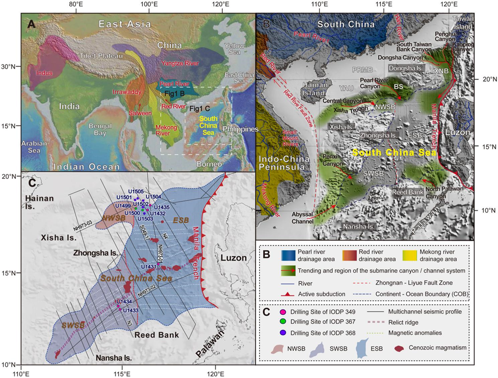 国际大洋发现计划(IODP)自2014年以来先后在南海执行了349、367、368及368x航次,在南海海盆区钻探了12口钻井,使得南海海盆区精准的层序地层格架建立成为可能。自然资源部海底科学重点实验室丁巍伟研究员(通讯作者)和上海交通大学海洋学院博士研究生王菲(第一作者)基于IODP钻探数据,对南海海盆区超过30条多道地震剖面进行了地质解释,首次对南海全海盆不同地质历史时期的沉积通量进行计算,从而对海盆的沉积过程进行半定量化约束,重建了南海海盆沉积物的百万年尺度的搬运和堆积过程,并对沉积过程的控制因素以