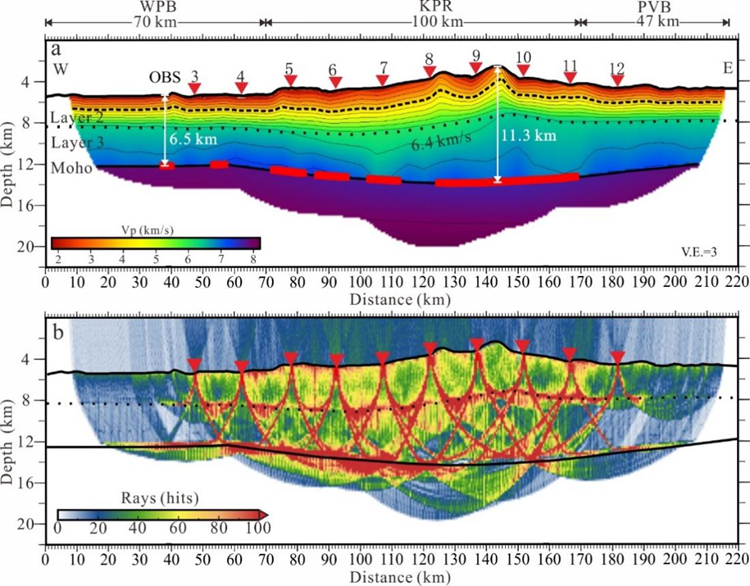 为揭示KPR南段的深部地壳结构特征,自然资源部海底科学重点实验室海底演化与动力过程团队利用2020年初我国首次在KPR南段获得的沿脊和跨过KPR脊的主动源OBS数据开展层析成像研究,获取KPR下方精细的纵波速度结构,据此对KPR沿脊方向和垂直脊方向的深部地壳结构进行分析。
