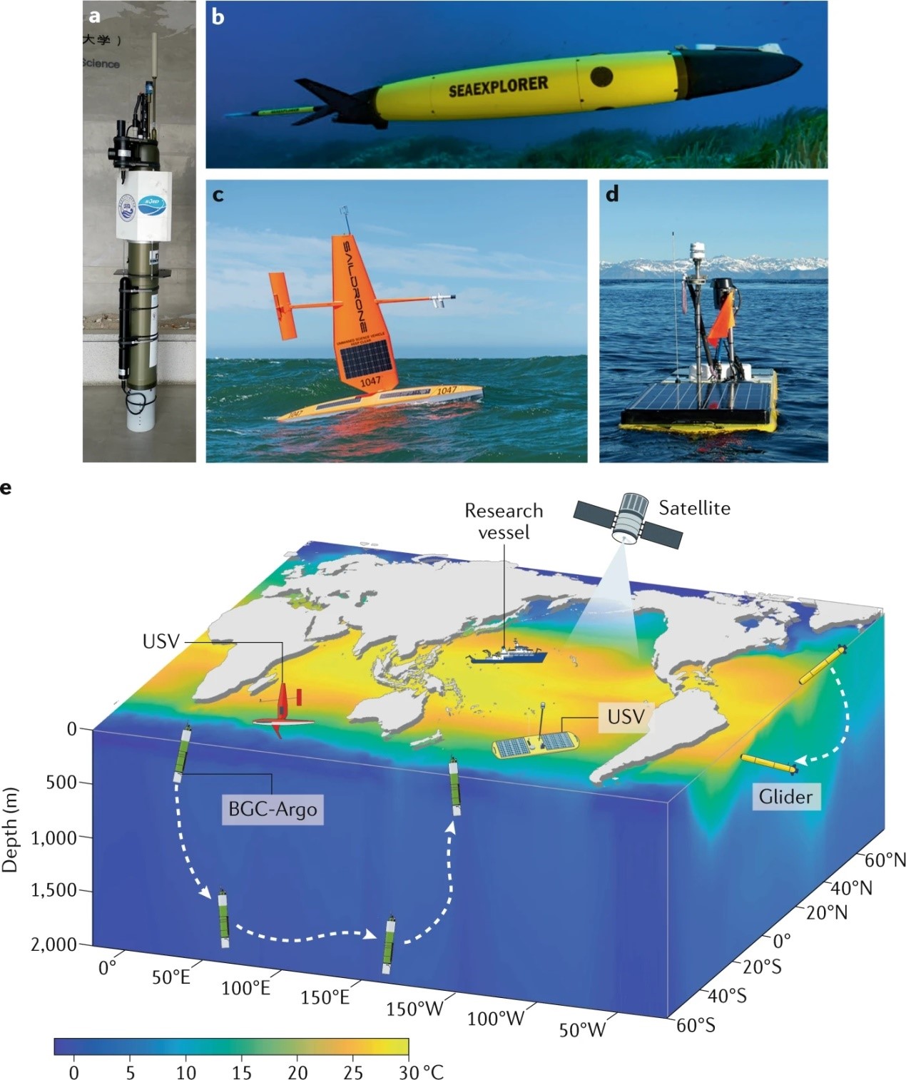 BGC-Argo program is an important part of the international Argo program, which is responsible for planning and managing the deployment of the BGC-Argo profiling floats (Fig. 2a). The program's objective is to establish a global biogeochemical and ecosystem observation array consist of 1000 profiling floats. It also represents an important development direction of the Argo program in the future, which is from single thermohaline observation to the comprehensive ocean observation platform. Making it able to support multi-scale marine biogeochemical research and ecosystem assessment. At the OceanObs'19, implementation details of the BGC-Argo program were improved, the improved program has better interaction and collaboration with the Argo program, thus it can realize the program's long-term vision—globalization, comprehensive, multidisciplinary. What's more, in some coastal areas, underwater glider (Fig. 2b) has already been widely used, in some places (such as the east and west coasts of the United States, the Mediterranean Sea) it has become routine operational observation; the unmanned sailing boats (Fig. 2c) and wave glider (Fig. 2d) are mainly used for basin-scale observation, relevant experiments have been carried out in the eddy zone of South Pacific Ocean and the South Ocean. The future regional ocean survey will be mainly based on the mode of multi-platform collaborative observation, to obtain multi-disciplinary important parameters synchronously in real-time.