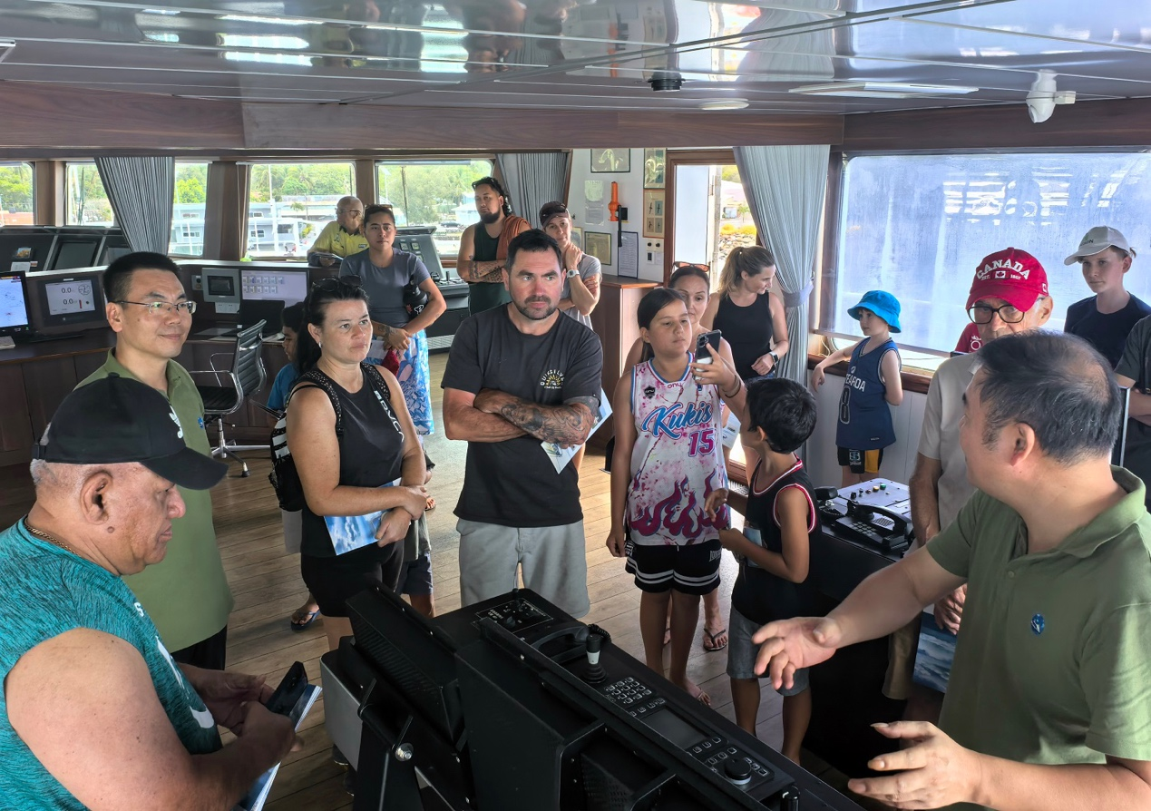 In the afternoon, the research vessel Dayang was opened to local residents, attracting more than one hundred visitors, including residents of the Cook Islands and tourists from Canada, New Zealand, Australia and other countries. Visitors showed great interest in China’s advanced research vessel and deep-sea exploration technologies and interacted frequently with the scientific team. In particular, many children posed various ocean-related questions to the researchers and received patient explanations, creating a lively and engaging atmosphere.