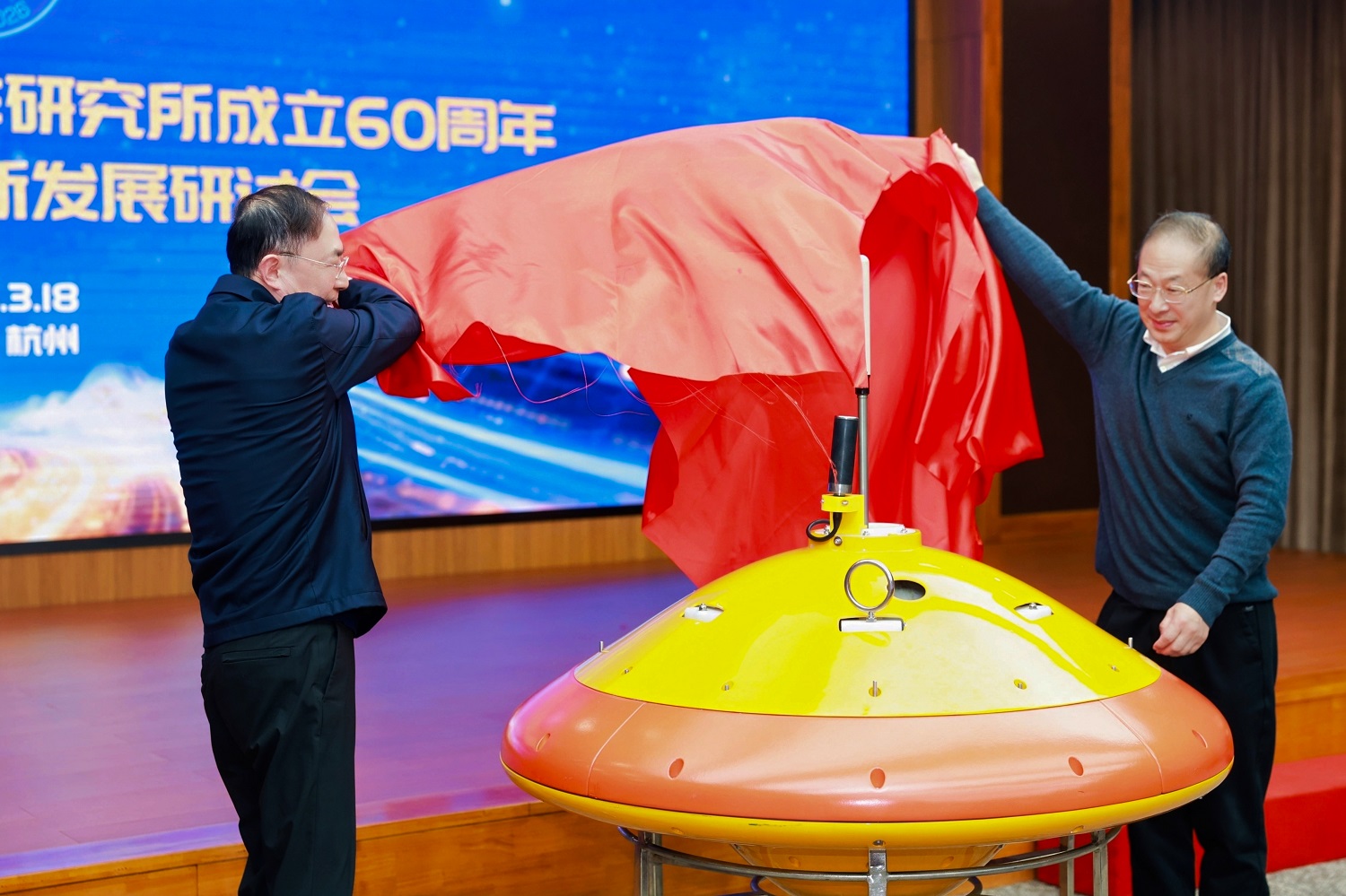李家彪院士和王会军院士为“海豚”沉浮式海洋地震仪揭幕
