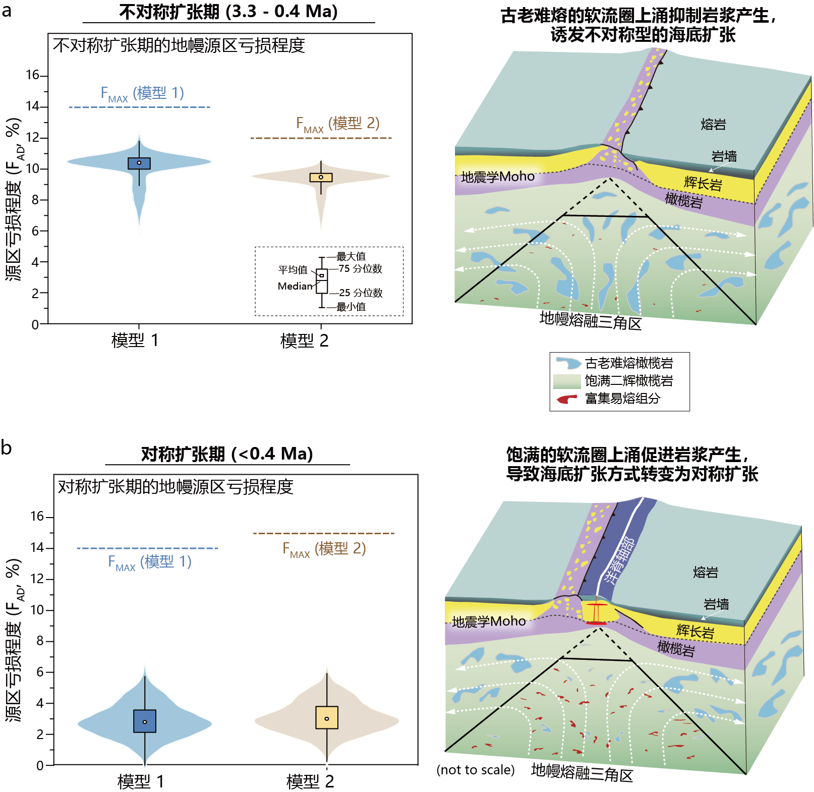 图2 软流圈成分的不均一性控制大西洋中脊23°N地区的海底扩张方式。(a)在3.3-0.4 百万年期间,由于软流圈中古老难熔地幔密度轻,优先进入洋脊下方的熔融区,造成该时期岩浆供给降低,洋脊发育拆离断层的非对称扩张;(b)0.4 百万年后,随着古老难熔地幔的迁移出熔融区,洋脊下方的软流圈中古老难熔地幔占比降低,增大了岩浆供给,拆离断层停止发育,洋脊发育对称扩张。